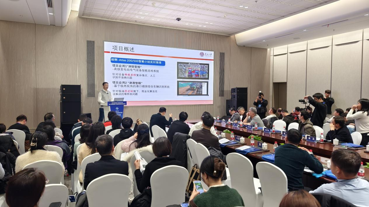 在路演现场,时晶磊和主要参与人周世豪分别介绍了项目中“高铁变电站电气设备智能巡检系统”与“基于极高视角的港口磅房综合车辆识别系统”两个应用。项目应用一“高铁变电站电气设备智能巡检系统”服务国家高铁重大需求,研发全流程国产化的高铁变电站智能巡检系统,保障百余种电气设备安防,实现室内外扰动的自矫正、自适应。系统已应用于全国10个铁路局辖区下160个高速铁路变电站,覆盖里程达3200公里。成果荣获华为昇腾AI创新大赛2024全国总决赛铜奖、天津赛区金奖,入选前0.5%优秀解决方案。项目应用二“基于极高视角的港口磅房综合车辆识别系统”荣获昇腾AI创新大赛2023天津赛区银奖,研发的港口磅房综合车辆识别系统能够保障恶劣开放环境下的稳定实时检测功能,优化运营效率。系统部署天津港3个辖区,2024年2月至今,累计服务百余万车次,解决了原有商业化方案无法识别的困难样本(雨、雪、雾霾、扬尘等极端恶劣环境干扰),平均节省8000人次/月人工复核成本。